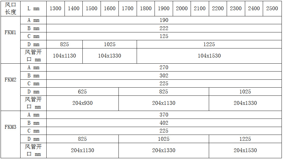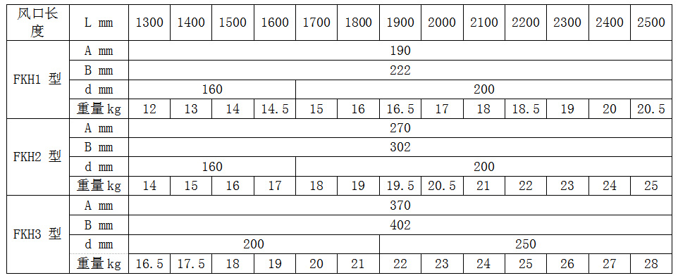 FKH型送風(fēng)口又有三種型號(hào),具體尺寸如下表所示: