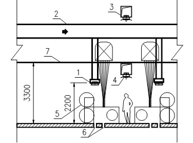 1-FKH型送風(fēng)口;2-小環(huán)境送風(fēng)管;3-大環(huán)境送風(fēng)(30%大環(huán)境送風(fēng)量)